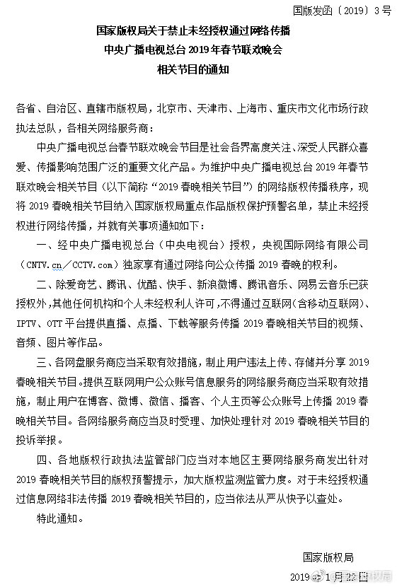 国家版权局关于禁止未经授权通过网络传播中央广播电视总台2019年春节联欢晚会相关节目的通知原标题:国家版权局关于禁止未经授权通过网络传播中央广播电视总台2019年春节联欢晚会相关节目的通知