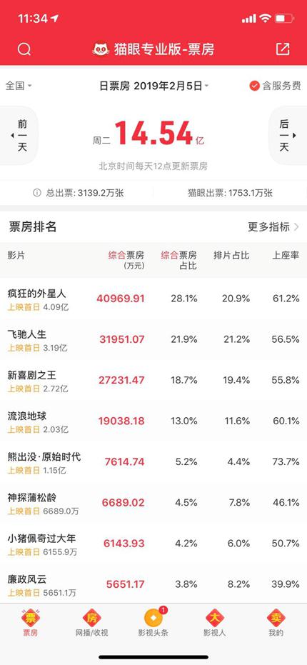 2月6日11:34猫眼专业版票房截图。作为预售票房冠军,宁浩导演的《疯狂的外星人》无悬念问鼎初一票房冠军,首日狂揽4亿元票房。可惜的是,口碑却表现不够“疯狂”,截至发稿前豆瓣评分为6.7分。相比宁浩导演之前的作品,《疯狂的外星人》口碑评分最低。