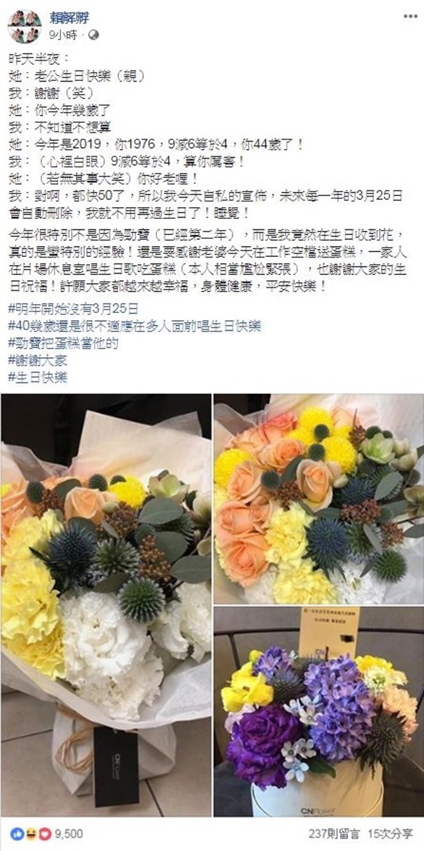 赖斯翔在个人社交网站大晒老婆送的靓花。Ella一家三口。赖斯翔分享了一段同老婆的对话。两人婚后十分甜蜜。 新浪娱乐讯 据香港媒体报道,歌手陈嘉桦性格豪爽奔放,近日是老公赖斯翔生日,Ella一反传统送